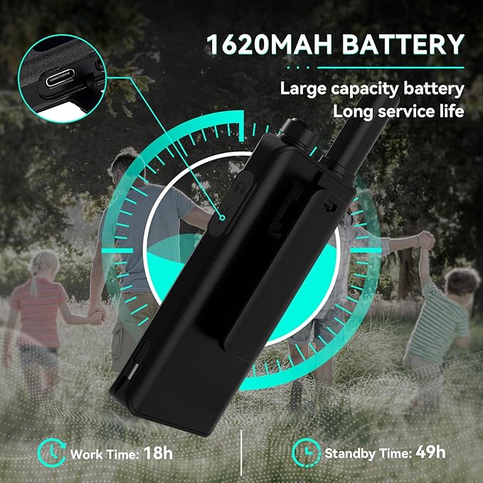 - Long battery life; rechargeable walkie talkies with 1620mAh Battery; support 18 to 24 hour continuous use; USB-C charging method; 2-in-1 charging cable;convenient to recharge two walkie talkies simultaneously