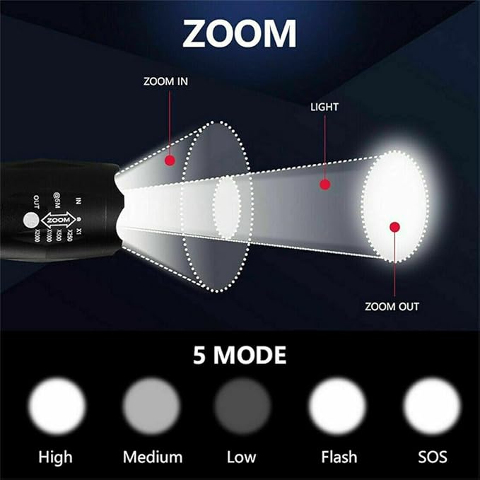 - Zoom Function: The beam range can be widened or narrowed by simply sliding the head part. Flashlight powerful enough to illuminate up to approx. 200m away Maximum output luminous flux reaches 2000 lumens.