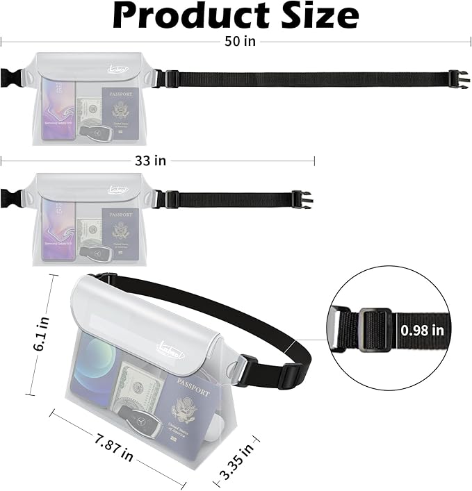 - 💼【Large Space】The measurement of waterproof bag is (7.8 x 6.1 x 3.3)inch. Our waterproof bag are different from other, We've added a base to the waterproof fanny pack and increased the space to fit all phones up to 7 inches and also hold your wallet, cash, passport, keys, etc. Waterproof fanny pack with adjustable waist strap (33 - 50)inch, suitable for most people.