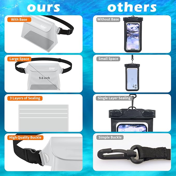 - 🌊【Reliable Materials】Waterproof pouch is made of high quality PVC material, smooth surface, durable, abrasion resistant, 3-layer sealing buckles protect valuables and IPX 8 lab certified up to 32 feet underwater. It is not only waterproof, but also dust-proof and snow-proof, It can be used in all weather to protect your valuables.
