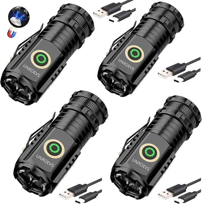 Mini Flashlight 2550 Lumens Rechargeable USB C Charging, Small Flashlights High Lumens 5 Modes, Pocket Flashlight with Clip, Magnetic Flashlight for EDC,Camping, Hiking,Emergency (4 Pack)