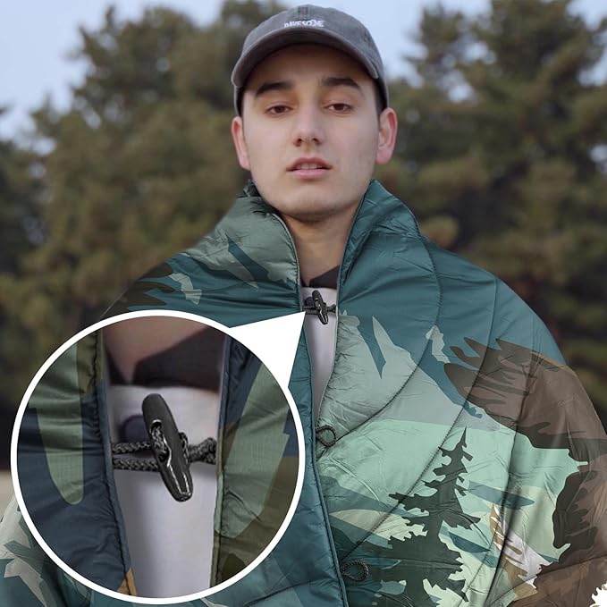 - Multipurpose Puffer Blanket and Poncho - This is a multi-purpose puffy blanket ultralight. In addition to being used as a warm camping blanket for sleeping for cold weather, the buttons on both sides combine to be used as a poncho, which is very convenient and can free your hands
