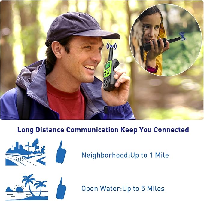 - 【 Long Distance Walkie Talkies】Walkie talkies’s communication range can reach 5 miles in open areas such as seaside villages.The two way radios can reach 1 mile in cities and towns.Weather, buildings and other obstructions will affect the range distance of the walkies talkies.