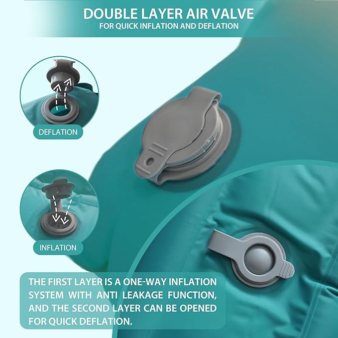 - 🏕️【Easy Inflation & Deflation】Save your time and efforts! Built-in pump needs only 30-60s to fully-inflate the camping mat, just simply step or press on it. No longer needs to inflate with your mouth or a pump. Only 1 sec to quickly deflate. The two double-layer valves on the pillows can effectively prevent air leaking and deflating in seconds.
