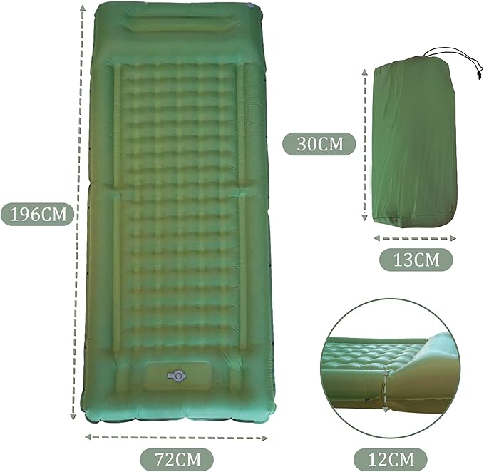 - ⚡【Ergonomic Integrated Design】The camping sleeping pad is equipped with a one-piece pillow that fits to the curve of the head and neck. The sides of the pad are higher than the middle position, it helps to give better support and balance, thus providing effective protection against turning over.