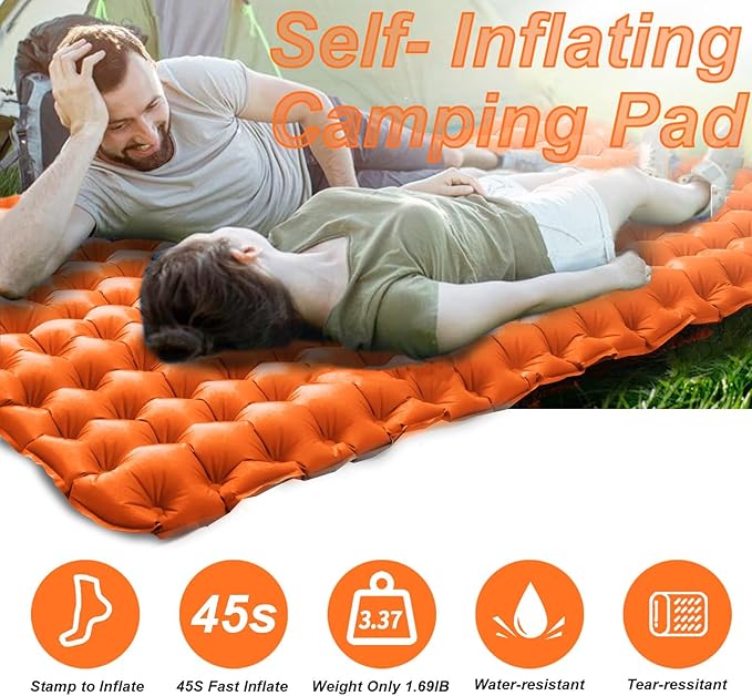 - 【Durable & comfortable Camping Mat】Double camping sleeping pad is made of camping-grade 40D Nylon and TPU coated, abrasion-resistant and tear-resistant, suitable for many different terrains, and durable enough to withstand harsh outdoor environments. Ergonomic design and pressure-dispersing bud pattern design provide a comfortable camping experience.