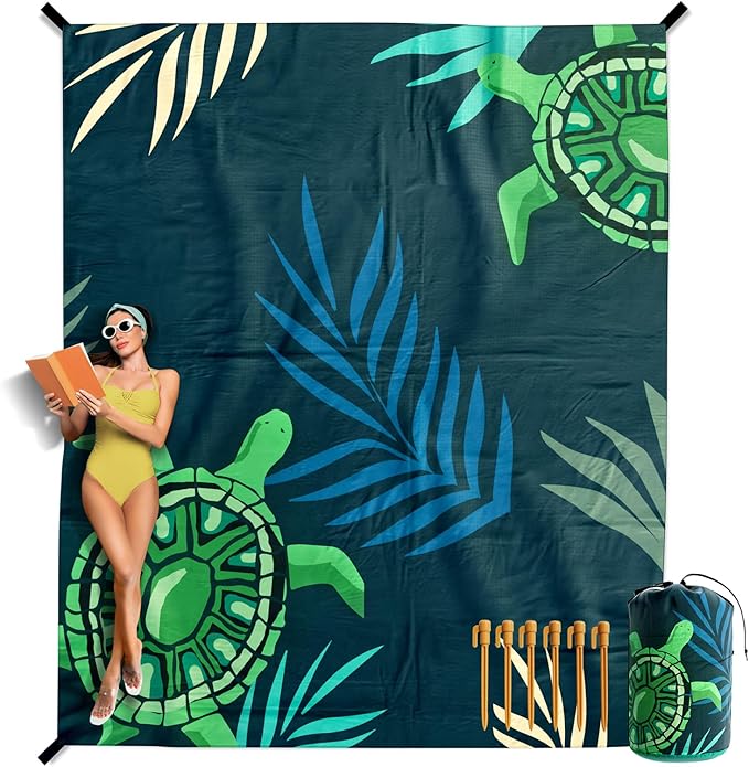 VENTURE 4TH Family-Size Beach Blanket: Sandproof, Waterproof, Lightweight & Compact. Includes Stakes and Carry Bag. 9x10 feet XXL Navy Turtle