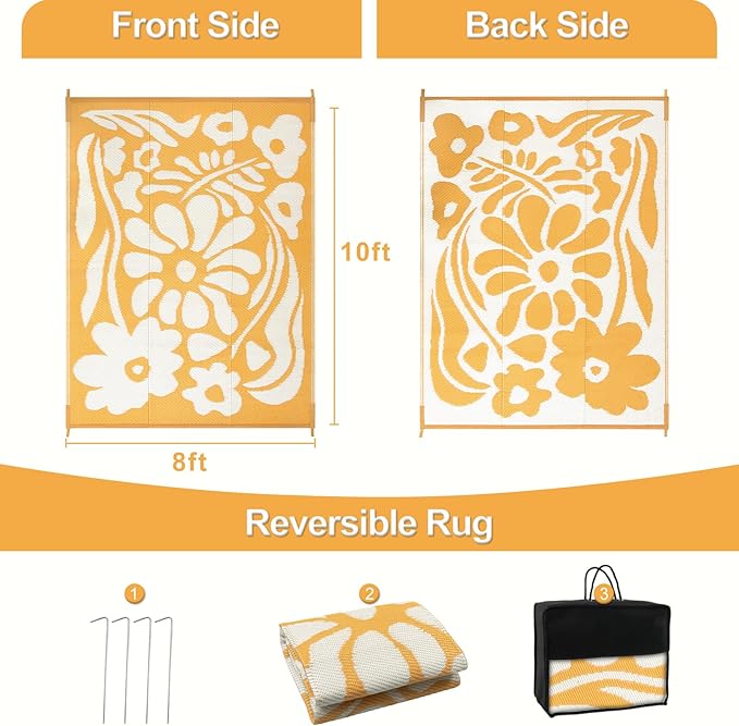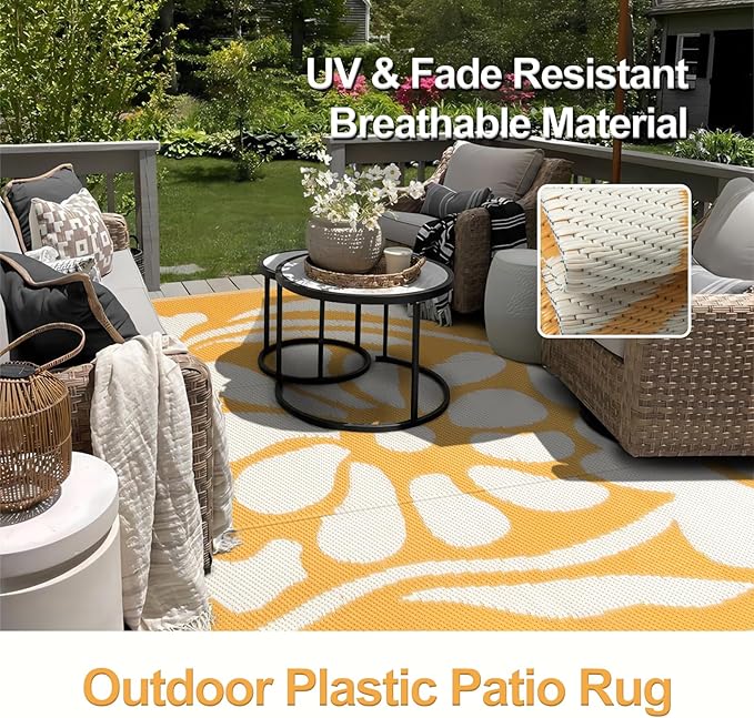 - [Versatile Outdoor Rug] The large outdoor rug is woven from a breathable, lightweight, comfortable plastic material that won't damage your deck or lawn. Ideal for patios, deck gardens, camping, picnics, RV road trips, beaches and indoor rooms