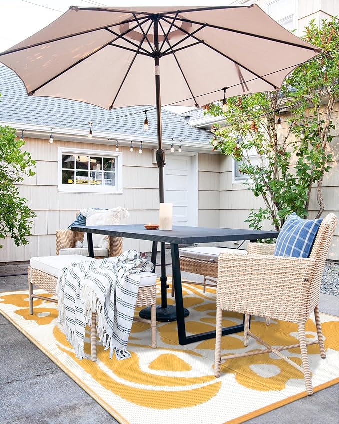 - [Easy Clean & Waterproof] The outdoor rug can handle any unexpected drink spills, food stains. Just hose it down or wipe it with a damp cloth, the breathable material will dry quickly, you can enjoy your outdoor time to the fullest without any hassle