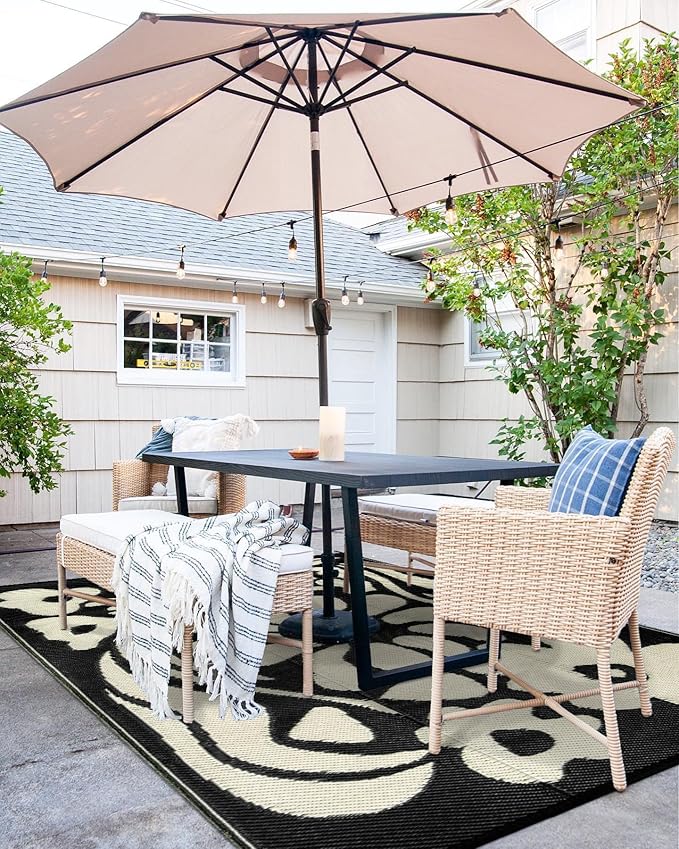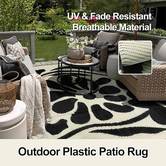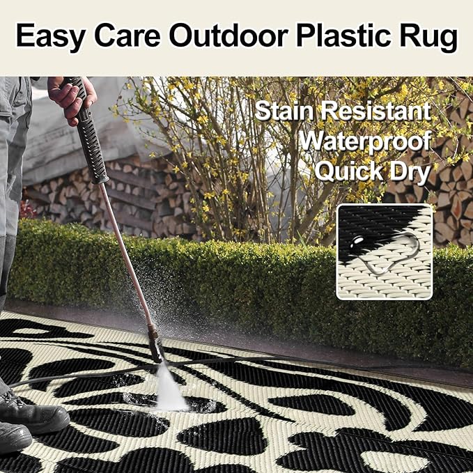 - [Easy Clean & Waterproof] The outdoor rug can handle any unexpected drink spills, food stains. Just hose it down or wipe it with a damp cloth, the breathable material will dry quickly, you can enjoy your outdoor time to the fullest without any hassle