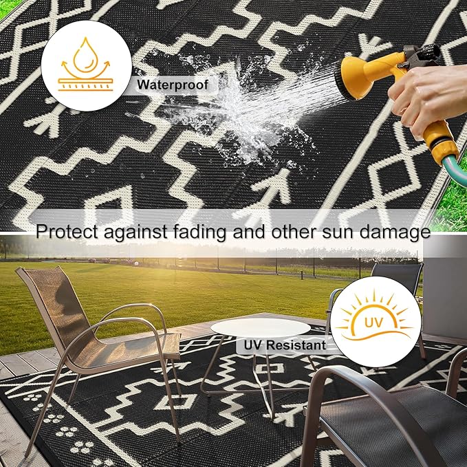 - [Reversible & Versatile] This outdoor camping rug is designed with two-sided geometric patterns, if one side is messed up, just flip over to get a new one, allows you to refresh your space in an instant. This boho outdoor carpet can be widely used in porch, patio, balcony, RV, deck, backyard, camper, balcony, picnic, tent.