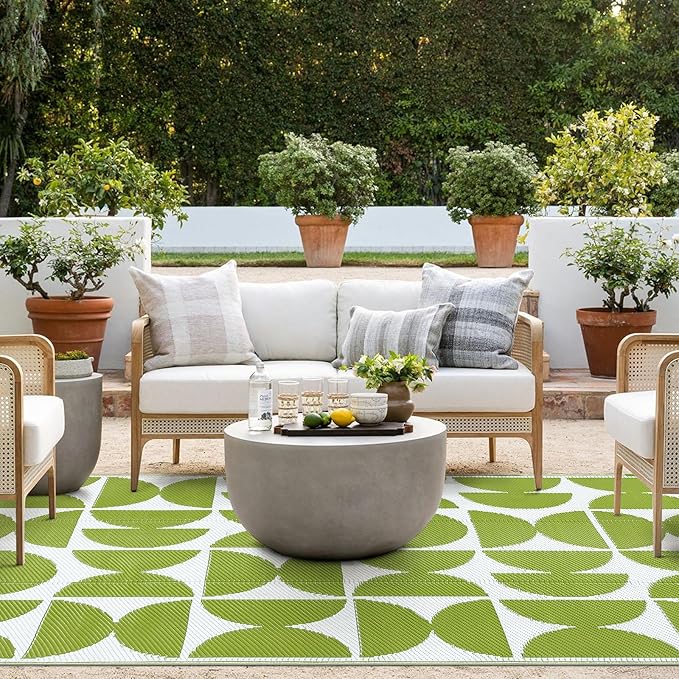 - 【UV-Protected & Reliable】-- Made from recycled plastic, this outdoor rug is finished with a UV-resistant coating that prevents fading and keeps colors vibrant. Reinforced edges ensure durability against heavy foot traffic and harsh weather conditions.