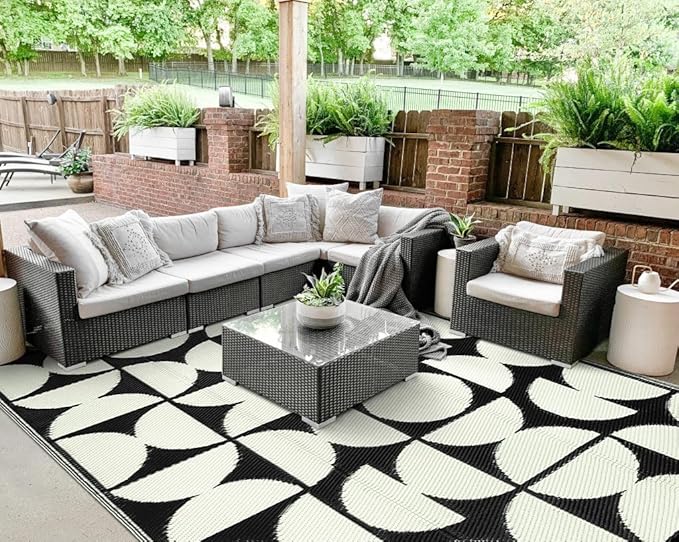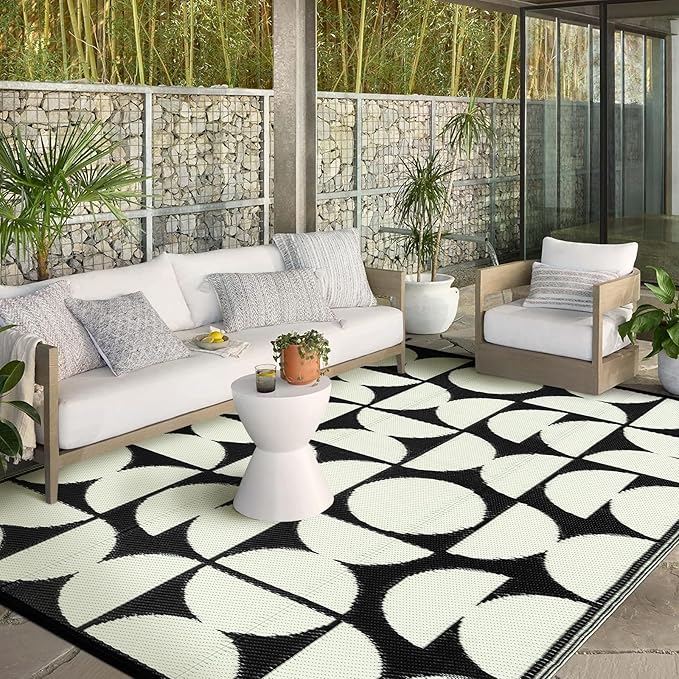 - 【UV-Protected & Reliable】-- Made from recycled plastic, this outdoor rug is finished with a UV-resistant coating that prevents fading and keeps colors vibrant. Reinforced edges ensure durability against heavy foot traffic and harsh weather conditions.