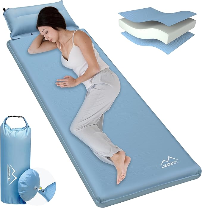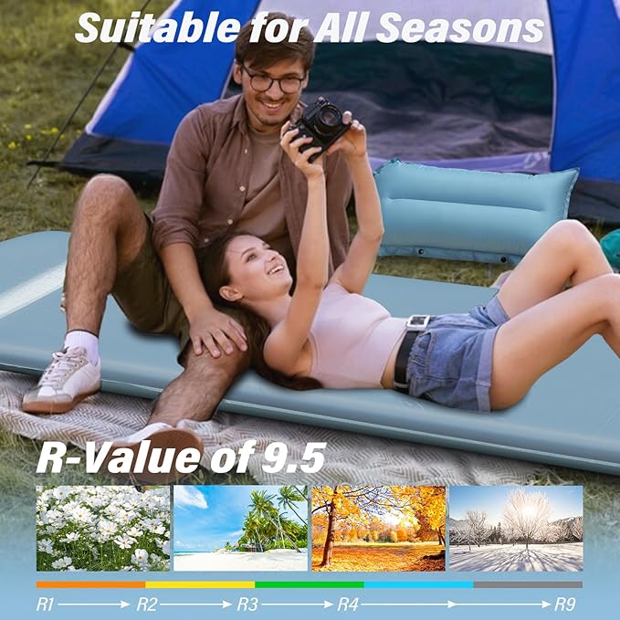 - Fit For All Seasons, No Noise - The sleeping pad's foam insulates cold air from the ground due to 9.5 R-Value Insulated, and the pongee waterproof coating on the surface is moisture-proof and breathable, keeping you warm in winter and cool in summer. The soft fabric of the self-inflating camping pad ensures no noise. You can sleep peacefully without any disturbance and wake up feeling refreshed.