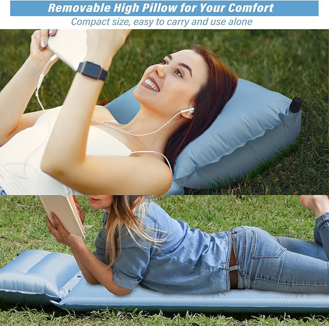 - Pillow Removable Design Camping Pad - Our sleeping pad is made of high-density, high resilience foam and tear-resistant fabric, 2 inches thickness allows you to lie down without feel touching the ground, perfect support and comfort. In addition, the pillows on the inflatable camping mat are removable for use alone and are purposely designed to be higher in height, making you feel like you're sleeping in your bed at home.