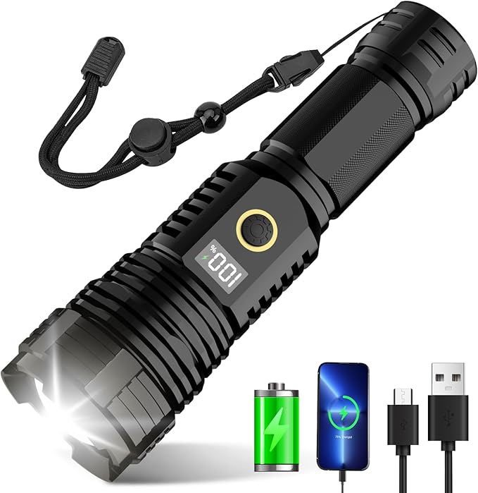 - 【Rechargeable Flashlights with LCD Digital Display】Super bright flashlight using a 5000mAh battery can work for 15 hours. Tactical flashlights high lumens rechargeable with fast-charging Type-C port only take 3 hours to fully charge, increasing charging speed by 50%. With USB output port, powerful tactical flashlight can be used as a power bank. The newly upgraded LCD power display is clearly visible, so you can always easily and accurately grasp the remaining power of the brightest flashlight.