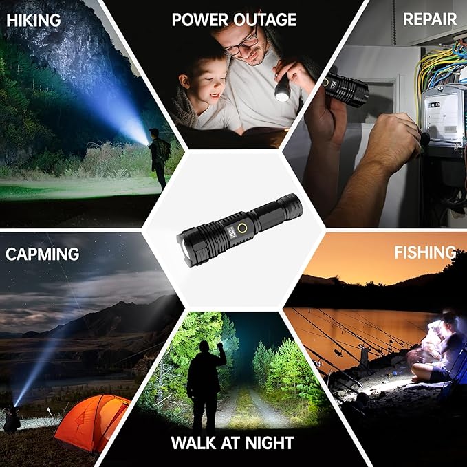 - 【Flashlights High Lumens】The super bright flashlight is equipped with an upgraded longbeam LED chip, with a brightness of up to 990,000 lumens, 500% brighter than car lights. Our bright flashlight rechargeable can illuminate the darkness with ease, providing you with the brightness and clarity you need to see clearly. Suitable rechargeable flashlights for emergencies, home, outdoor camping, hiking.