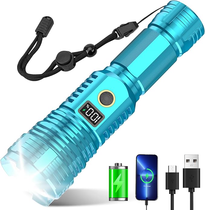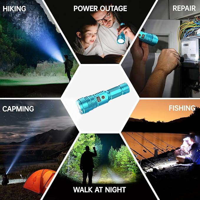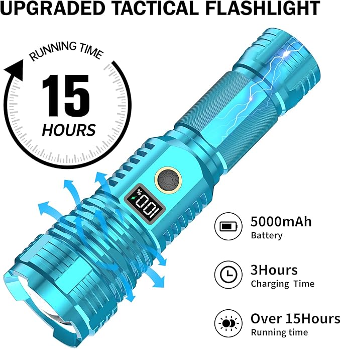 - 【Rechargeable Flashlights with LCD Digital Display】Super bright flashlight using a 5000mAh battery can work for 15 hours. Tactical flashlights high lumens rechargeable with fast-charging Type-C port only take 3 hours to fully charge, increasing charging speed by 50%. With USB output port, powerful tactical flashlight can be used as a power bank. The newly upgraded LCD power display is clearly visible, so you can always easily and accurately grasp the remaining power of the brightest flashlight.
