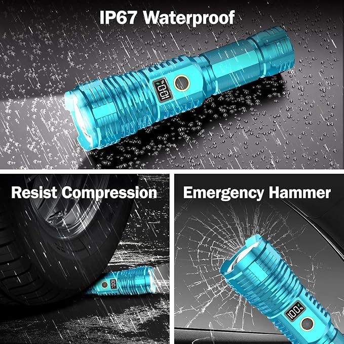 - 【IP67 Waterproof & Sturdy】Due to the built-in high tenacity seal rubber, the bright flashlight rechargeable reaches IP67 waterproof level. The flash light can be used in heavy rain, snow, and other harsh weather conditions. Made of aviation grade aluminum alloy, the flashlight is anti drop and shatter-resistant, so you don't need to worry about dropping the flash light.