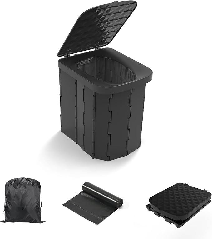 Portable Camping Toilet for Adults - Hapoon XL Portable Folding Toilet with Lid,Travel Portable Potty for Adults,Porta Potty Car Toilet,12 Toilet bags, 12 pack Liquid Waste Gel,Black