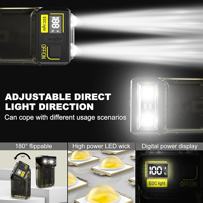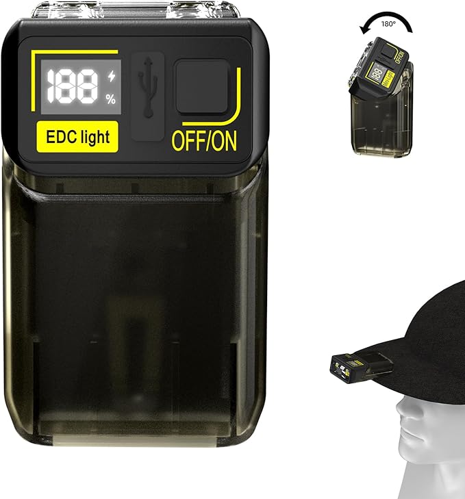 Mini Flashlight with Clip, Digital Power Display Rechargeable Cap Lights Clip On Hat, 180 Degree Twist Small Flash Light, LED Magnetic Flat EDC Pocket Light for Running, Camping, Cycling