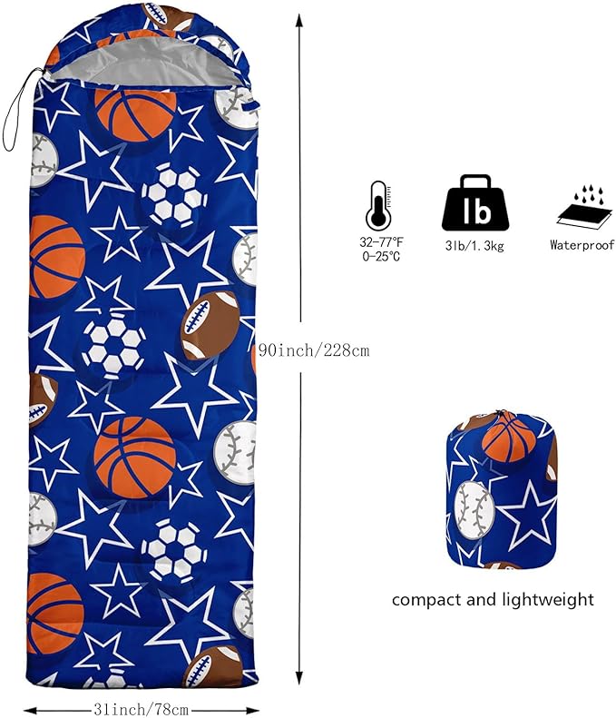 - SUITABLE:The sleeping bag can be used for 3 Seasons.SIZE:90.5"L x 31.5"W Suggenal extreme temperature: 41 ℉ -77 ℉.Applicable in a variety of scenarios,such as Travel camping pajamas party,It's very suitable for you to travel with your children.Half-circle hood with adjustable drawstring,which can keep you warm and prevent your humidity