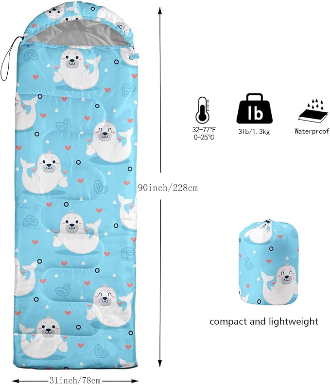 - SUITABLE:The sleeping bag can be used for 3 Seasons.SIZE:90.5"L x 31.5"W Suggenal extreme temperature: 41 ℉ -77 ℉.Applicable in a variety of scenarios,such as Travel camping pajamas party,It's very suitable for you to travel with your children.Half-circle hood with adjustable drawstring,which can keep you warm and prevent your humidity