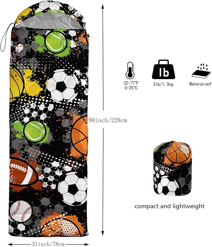 - SUITABLE:The sleeping bag can be used for 3 Seasons.SIZE:90.5"L x 31.5"W Suggenal extreme temperature: 41 ℉ -77 ℉.Applicable in a variety of scenarios,such as Travel camping pajamas party,It's very suitable for you to travel with your children.Half-circle hood with adjustable drawstring,which can keep you warm and prevent your humidity
