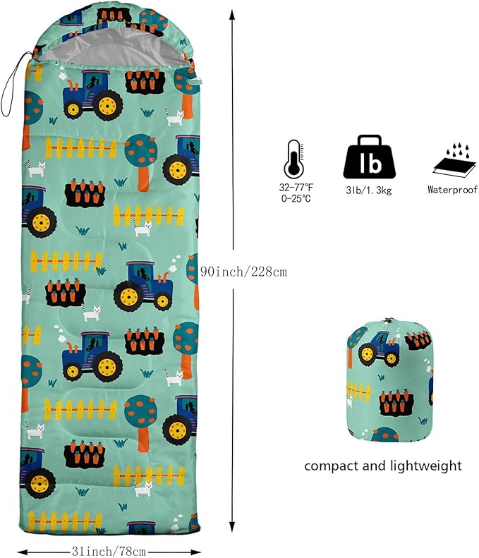 - SUITABLE:The sleeping bag can be used for 3 Seasons.SIZE:90.5"L x 31.5"W Suggenal extreme temperature: 41 ℉ -77 ℉.Applicable in a variety of scenarios,such as Travel camping pajamas party,It's very suitable for you to travel with your children.Half-circle hood with adjustable drawstring,which can keep you warm and prevent your humidity