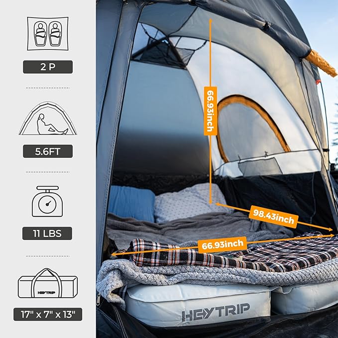 - Suitable For Pickup Truck:Transform your 5.0–6.8 ft pickup truck bed into a comfortable campsite with the HEYTRIP truck bed tent! This roomy pickup truck tent is perfect for camping and providing a cozy sleeping experience off the ground for two adults.