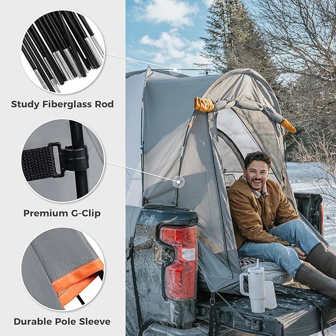 - Upgraded Ventilation: This tent for pickup truck is designed with 1 large entrance door, 2 big side mesh windows, all double-layered for optimal ventilation. The large mesh windows enhance airflow, keeping the inside temperature regulated and comfortable.