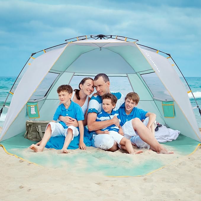 - BEasy Setup & Super Stable: The specially designed spring opening system shows an industry-leading level of improvement. One person can set up the beach tent easily in seconds. Compared to the drawstring design, this one is faster, effortless, and saves more time. The 8.5 mm thick fiberglass poles make the tent stronger. Equipped with 3 sandbags, 4 wind ropes and 10 stakes to ensure stability and prevent it from being blown away in the wind.