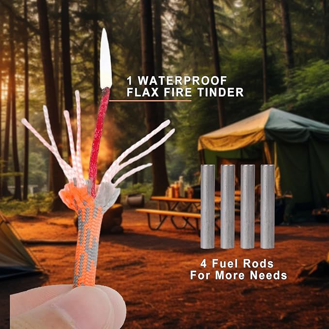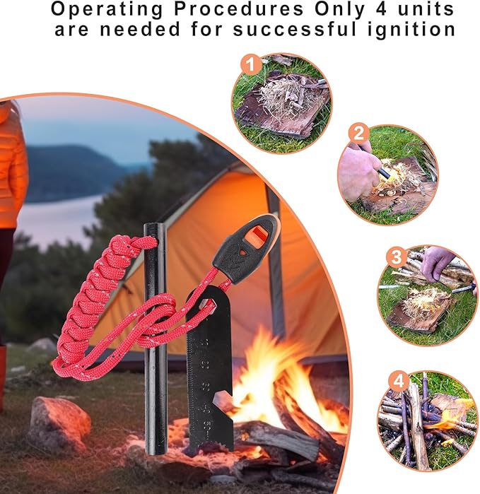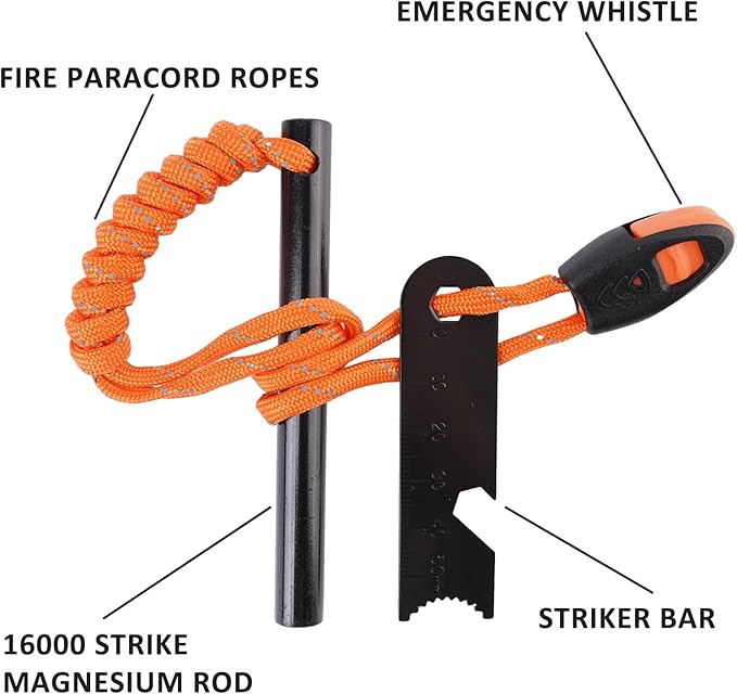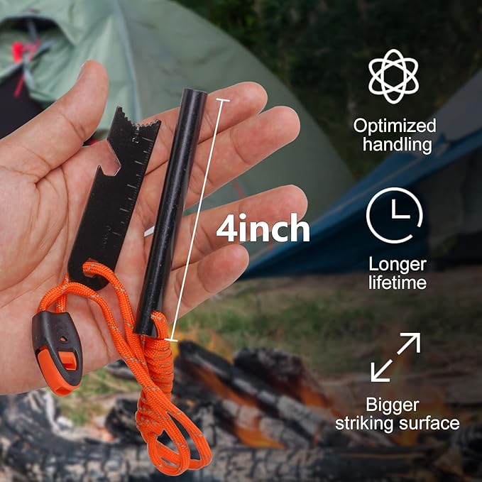 - 【UPGRADED DESIGN】Each fire rod comes with a 42" reflective paracord lanyard, emergency whistle,4 booster rods,and a 6-function multi-tools.42-inch reflective parachute cord, long enough to attach the assembly; 4 booster rods for more needs;The fire starter flint features a bottle opener, hex wrench,Hex key chain,micro ruler, map scale, and sharp spine scraper.a good helper for outdoor assistance.
