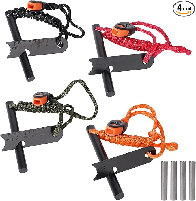 Ferro Rod Fire Starter 4 Pack Flint Fire Starter Survival Tool Flint and Steel Fire Starter Kit 6-in-1,Fire Steel with Paracord and Whistle for Camping, Hiking, Hunting, Emergency Rescue…