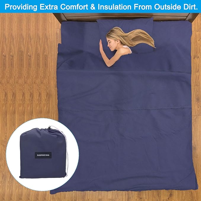 - Application: Our sleeping bag liner is an essential accessory for any camping or travel enthusiast. It is used as a lining for sleeping bags, providing extra comfort and insulation from outside dirt. Widely used in camping, traveling, hotel, train, etc. or as a replacement for bed covers at home.