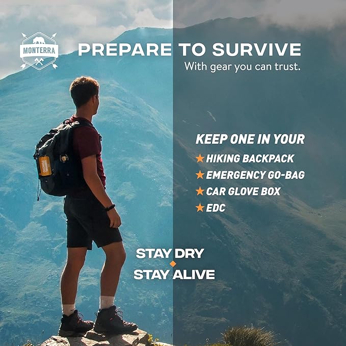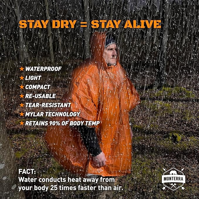 - STAY DRY = STAY ALIVE: This emergency survival poncho is crafted from 100% waterproof thermal mylar material with sealed seams, ensuring you stay dry, warm, and alive in extreme conditions. Engineered to reflect up to 90% of your body heat, it shields you from wind, rain, and snow, making it your essential layer of protection against unpredictable weather.