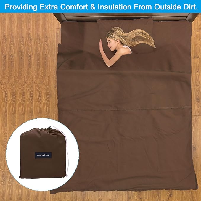 - Application: Our sleeping bag liner is an essential accessory for any camping or travel enthusiast. It is used as a lining for sleeping bags, providing extra comfort and insulation from outside dirt. Widely used in camping, traveling, hotel, train, etc. or as a replacement for bed covers at home.