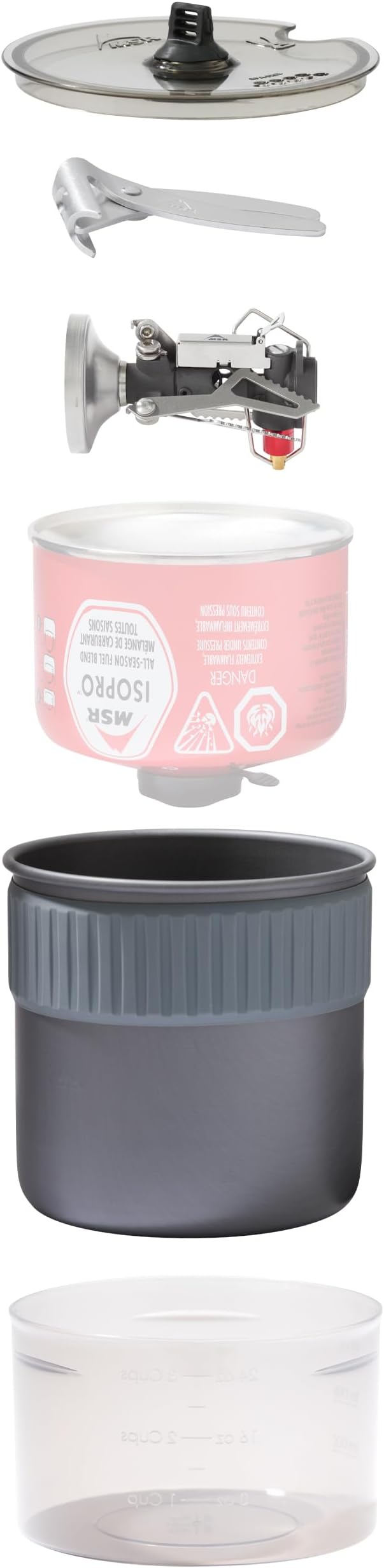 - Kit nests together with room to fit an optional MSR fuel canister inside pot (fuel canisters sold separately); cook set has the capacity to serve two
