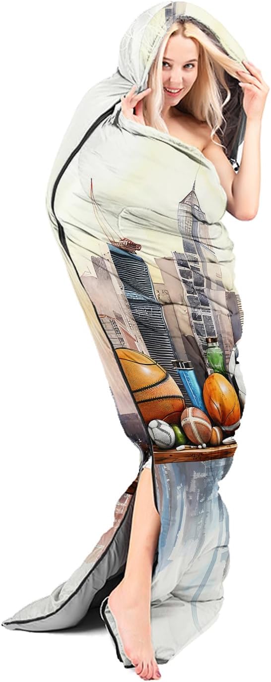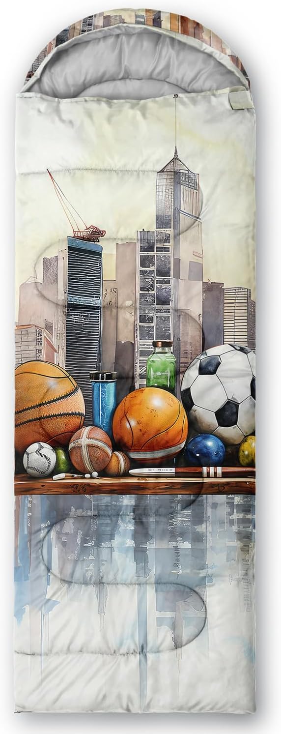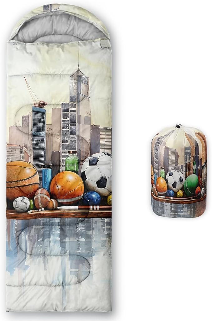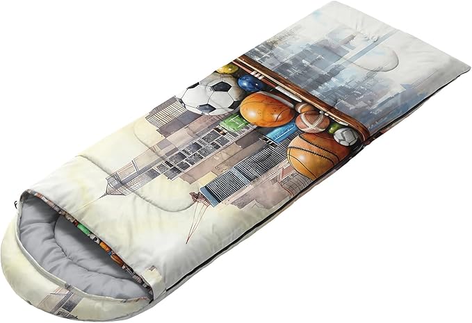 - Cartoon Sports Ball City Skyline sleeping bags For All Seasons- Our camping sleeping bags are designed to give you a good night's sleep. Ideal for spring,summer,fall,and winter,rated from 32°F to 77°F (optimal comfort temperature is 50°F to 65°F). Stay comfortable and warm in any condition at normal altitude. Can be used for any outdoor adventure,class camping,summer camps,couch surfing,indoor blanket,and as an emergency blanket for vehicles.
