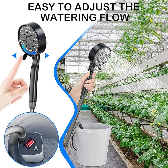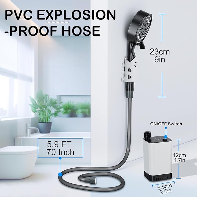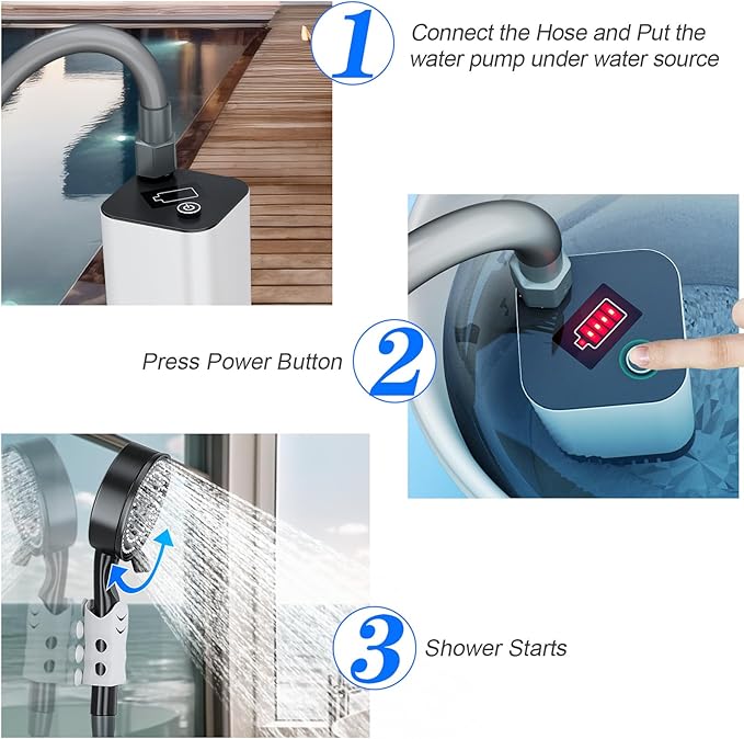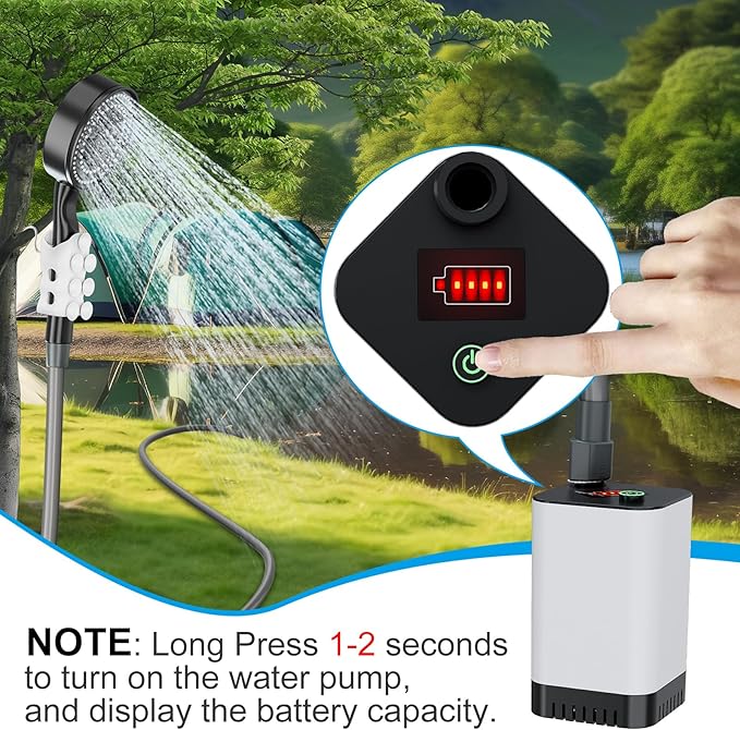 - LONG LASTING BATTERY: The shower Pump Features IPX7 water-resistant and USB Rechargeable, built in high capacity 5200mAh battery and power button and display, you can simply charge the pump via the included USB cable and enjoy a gentle shower up to 90 minutes