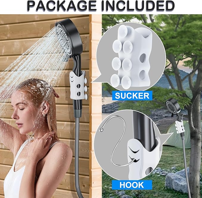 - HANDSFREE EXPERIENCE: Features suction cup mount and hooks for hanging shower head from a glass window, tree and more. Package includes 1pc showerhead, 1pc Hose, 1pc Pump, 1pc Storage mesh bag, 1pc USB charging cable, 1pc S-shape Hook, 4pcs suction cups