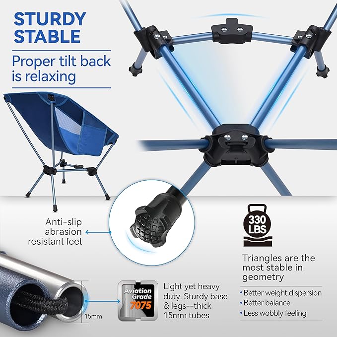 - Superior Comfort: Proper tilt angle allows you to lounge comfortably in this chair while maintain a normal sitting posture to chat with friends. Triangular base distributes weight evenly, keeping gravity balanced without wobbling. Ripstop polyester seat and robust aircraft-grade aluminum frame ensure long-term use.