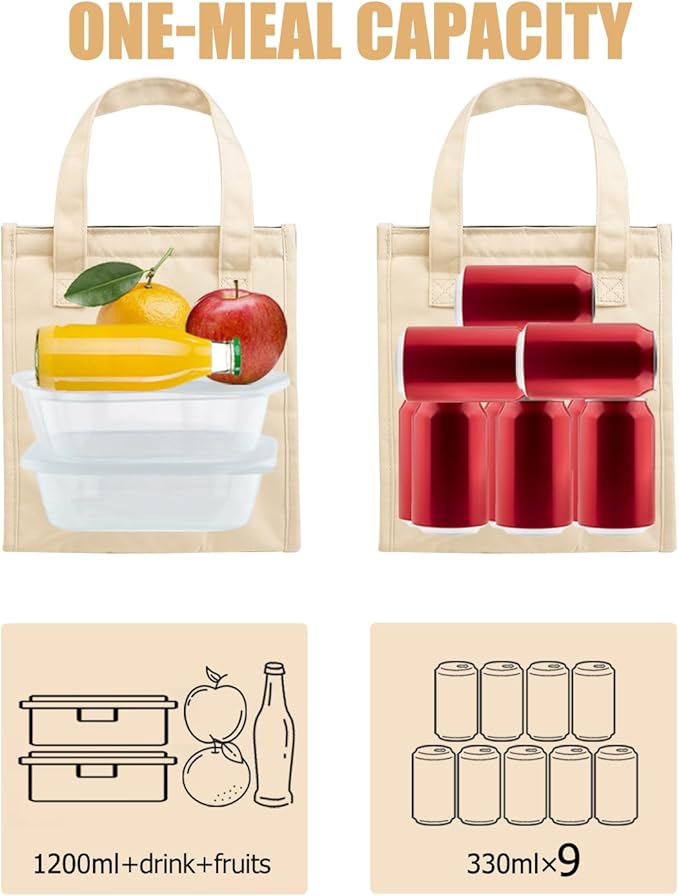 Fmeida Insulated Lunch Bag Women, Simple Lunch Tote Bags, Waterproof Thermal Cooler Lunch Bag, Reusable Adult Lunch Box Bag for Women | Small Beige, Front&Side&Interior Pockets