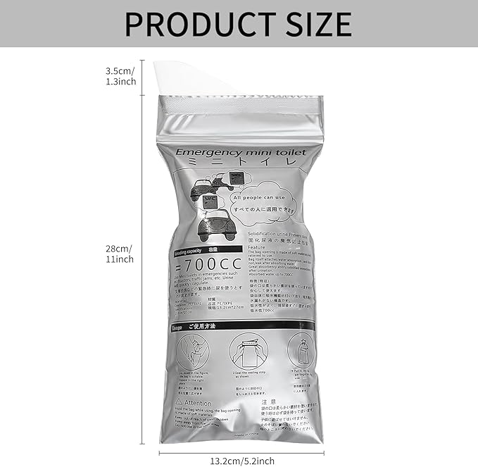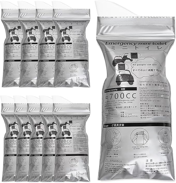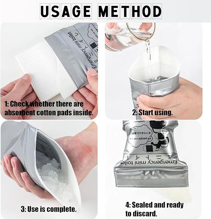 - Portable and Easy to Use: These emergency urine bags are lightweight, foldable, and easily portable, fitting into bags, purses, or glove compartments. Just open the bag and use it - the absorbent polymer inside quickly turns liquid into an odorless, spill-proof gel within 60 seconds.