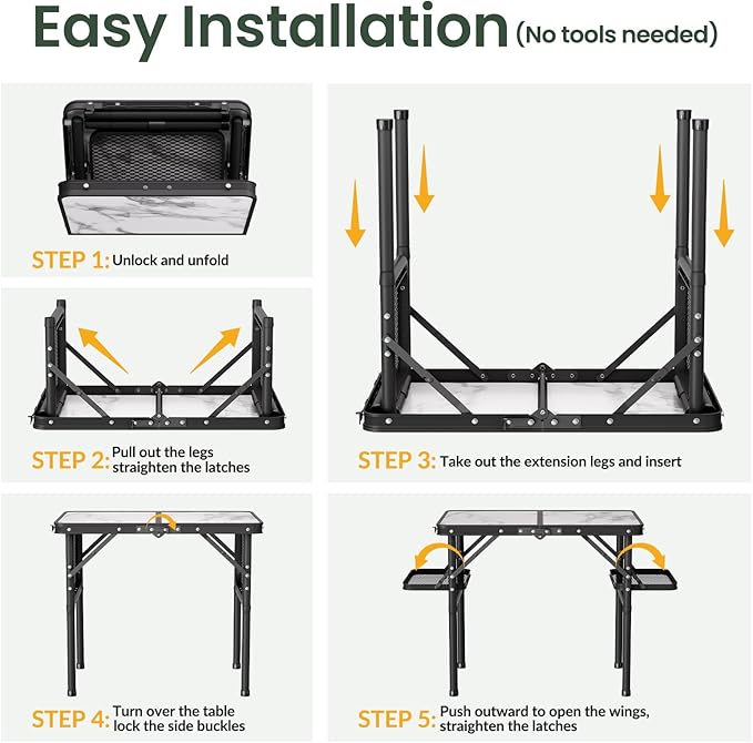 - Simple 5-step Installation (No tools needed). Step 1: Unlock and unfold. Step 2: Pull out the legs and straighten the latches. Step 3: Take out the extension legs and insert. Step 4: Turn over the table and lock the side buckles. Step 5: Push outward to open the wings, straighten the latches. Done. Please refer to the installation steps in the picture.