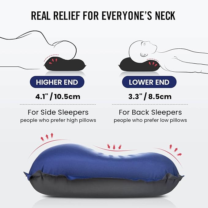 - 𝐀𝐜𝐡𝐞-𝐅𝐫𝐞𝐞 𝐟𝐨𝐫 𝐁𝐚𝐜𝐤 𝐚𝐧𝐝 𝐒𝐢𝐝𝐞 𝐒𝐥𝐞𝐞𝐩𝐞𝐫𝐬 - Side sleepers usually need a thicker inflatable camping pillow for more support to spine, while back sleepers tend to prefer a blow up pillow of middle height. Taking both into consideration, we've designed our travel pillow with a lower and a higher end to provide varied support for everyone. Free your neck and wake up fresh from any sleeping position!