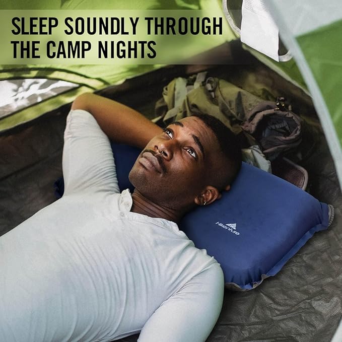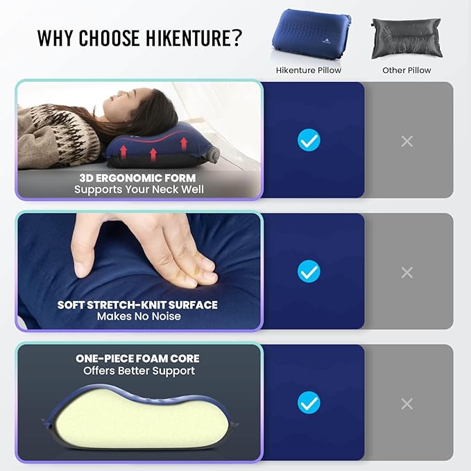 Hikenture Self Inflating Camping Pillow, Foam Travel Pillows for Sleeping, Ergonomic 3D Support Inflatable Pillow, Compressible Blow Up Camp Pillow, Portable Backpacking Pillow, Blue