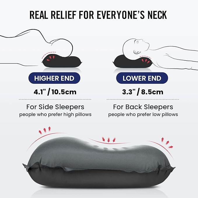 - ✌ 𝐀𝐜𝐡𝐞-𝐅𝐫𝐞𝐞 𝐟𝐨𝐫 𝐁𝐚𝐜𝐤 𝐚𝐧𝐝 𝐒𝐢𝐝𝐞 𝐒𝐥𝐞𝐞𝐩𝐞𝐫𝐬 ✨ - Side sleepers usually need a thicker inflatable camping pillow for more support to spine, while back sleepers tend to prefer a blow up pillow of middle height. Taking both into consideration, we've designed our travel pillow with a lower and a higher end to provide varied support for everyone. Free your neck and wake up fresh from any sleeping position!