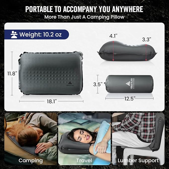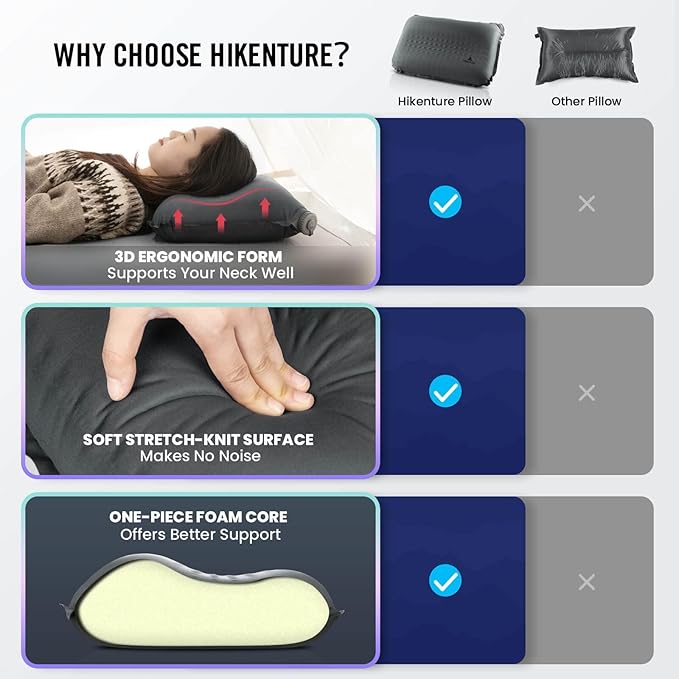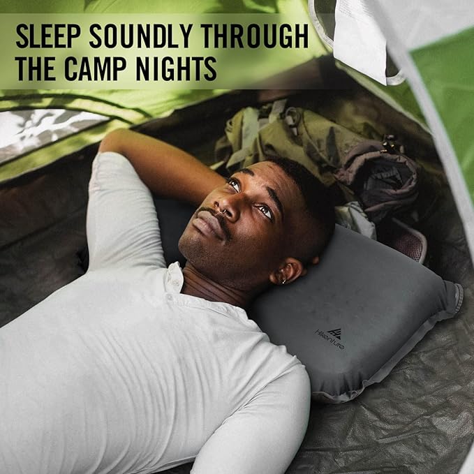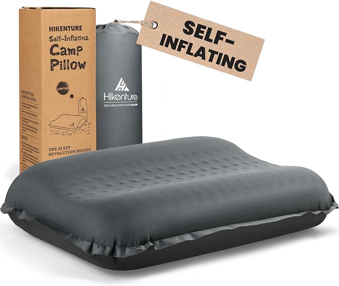 Hikenture Self Inflating Camping Pillow, Foam Travel Pillows for Sleeping, Ergonomic 3D Support Inflatable Pillow, Compressible Blow Up Camp Pillow, Portable Backpacking Pillow, Grey