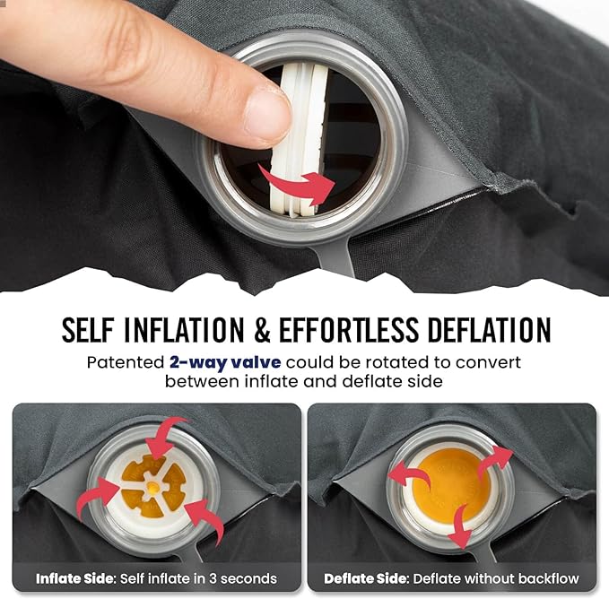 - 😷 𝐒𝐞𝐥𝐟-𝐈𝐧𝐟𝐥𝐚𝐭𝐚𝐛𝐥𝐞? 𝐘𝐞𝐬! ✨ - No more struggling to inflate camp pillows with your mouth! Our inflatable travel pillow could self inflate rapidly in seconds thanks to the patented double sided valve which has never been used on air pillows before due to its high cost. But we still decided to go with it because it really makes inflating and deflating a breeze.